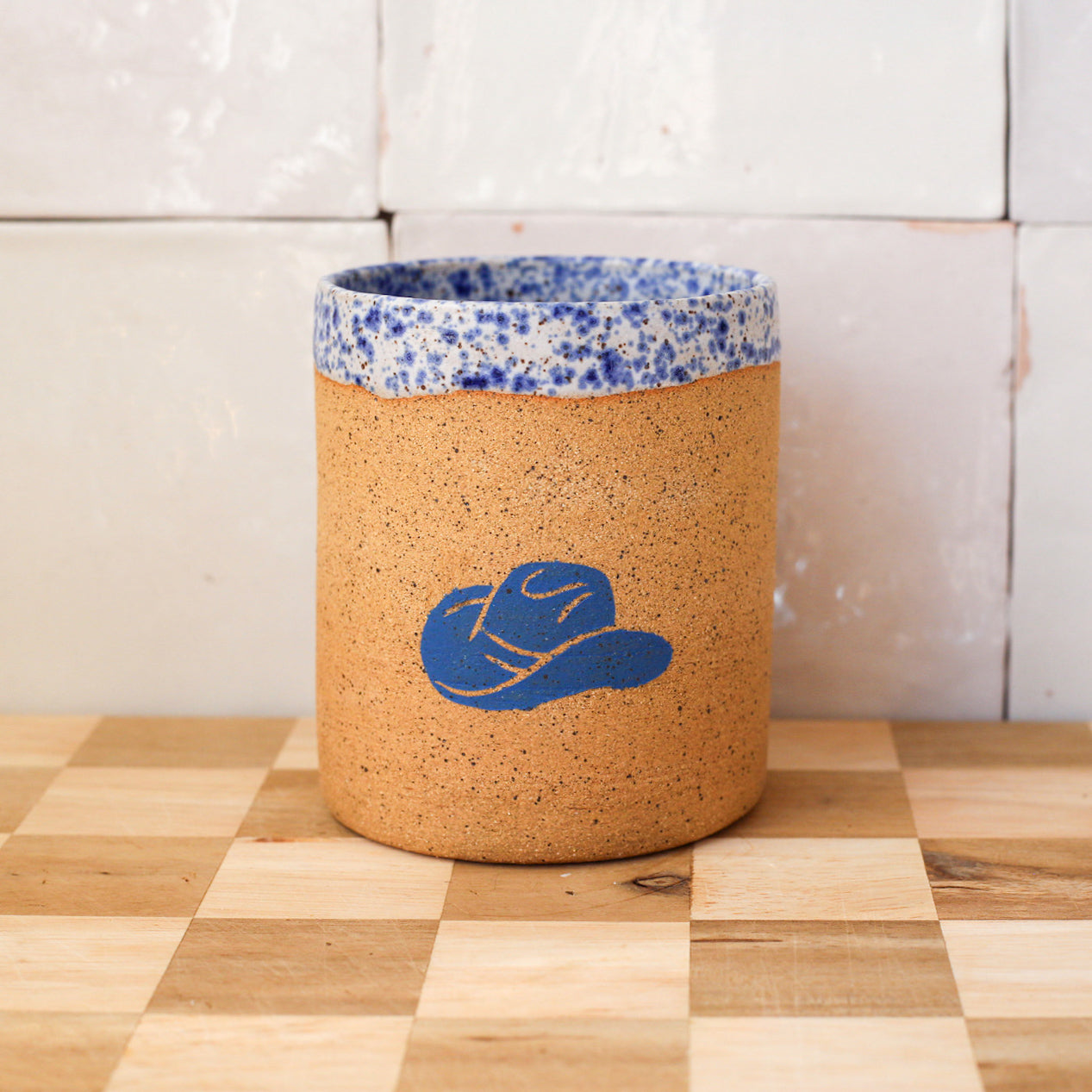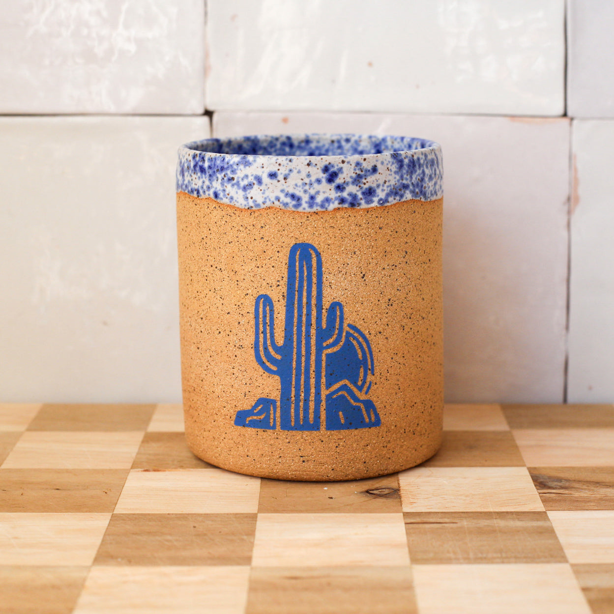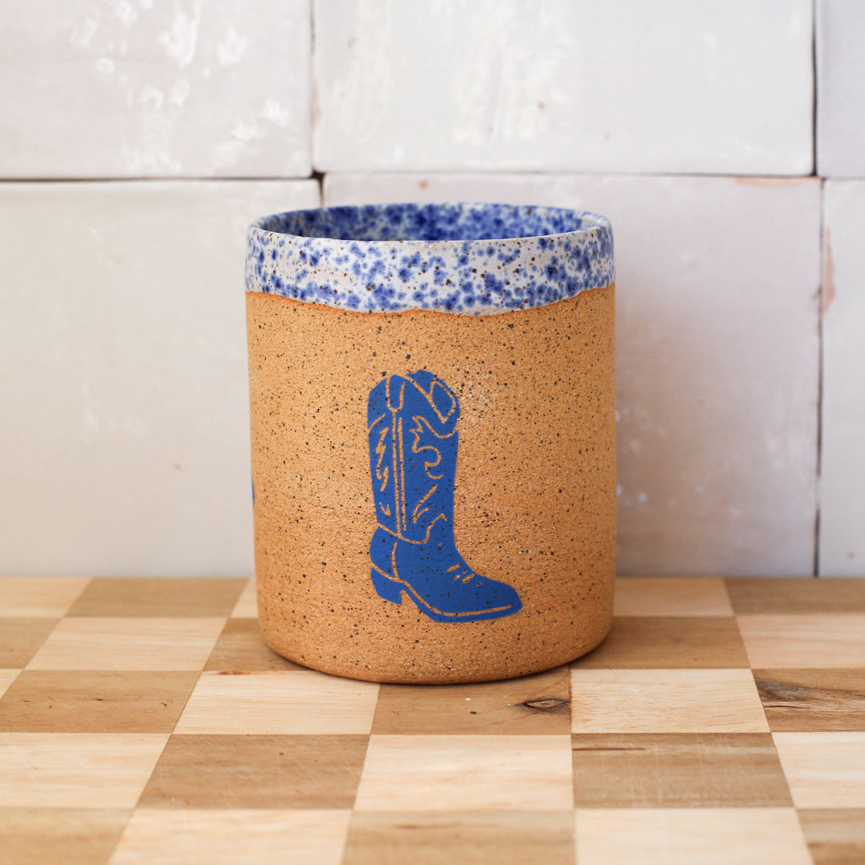 These mugs are made with a light bodied clay and are hand painted using 3 custom decals around the cup and then fired twice and glazed in a satin white and blue speck!